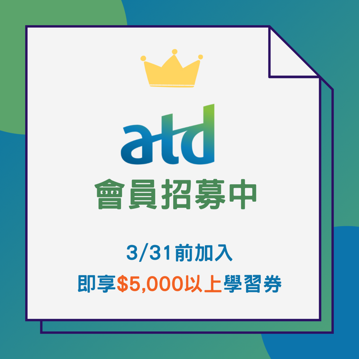 2026.02.20起至2026.03.31止加入美國ATD會員,使用優惠碼可現省US$30 (國際會員)或US$50 (國際超級會員)。除享有美國ATD會員如下之好處及資源,還可獲得ATD台灣交流會提供的NT$5,000 (國際會員)或NT$7,000 (國際超級會員)學習券,及會員專屬福利!